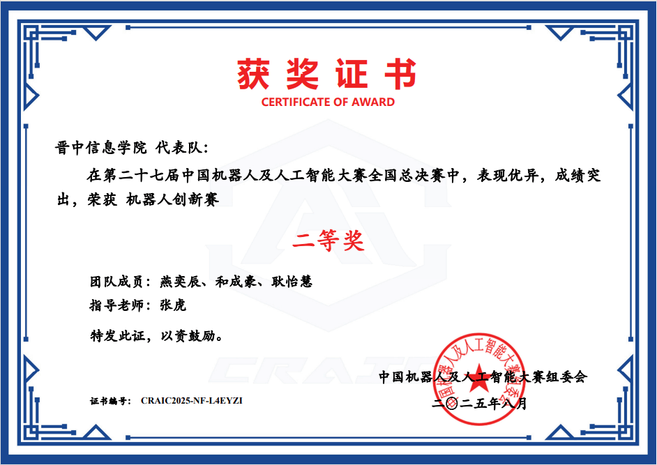 第二十七届中国机械人及人工智能大赛山西赛区角逐,晋中消息学院代表队(燕奕辰、和成豪、耿怡慧,张虎指点)荣获机械人立异赛二等。