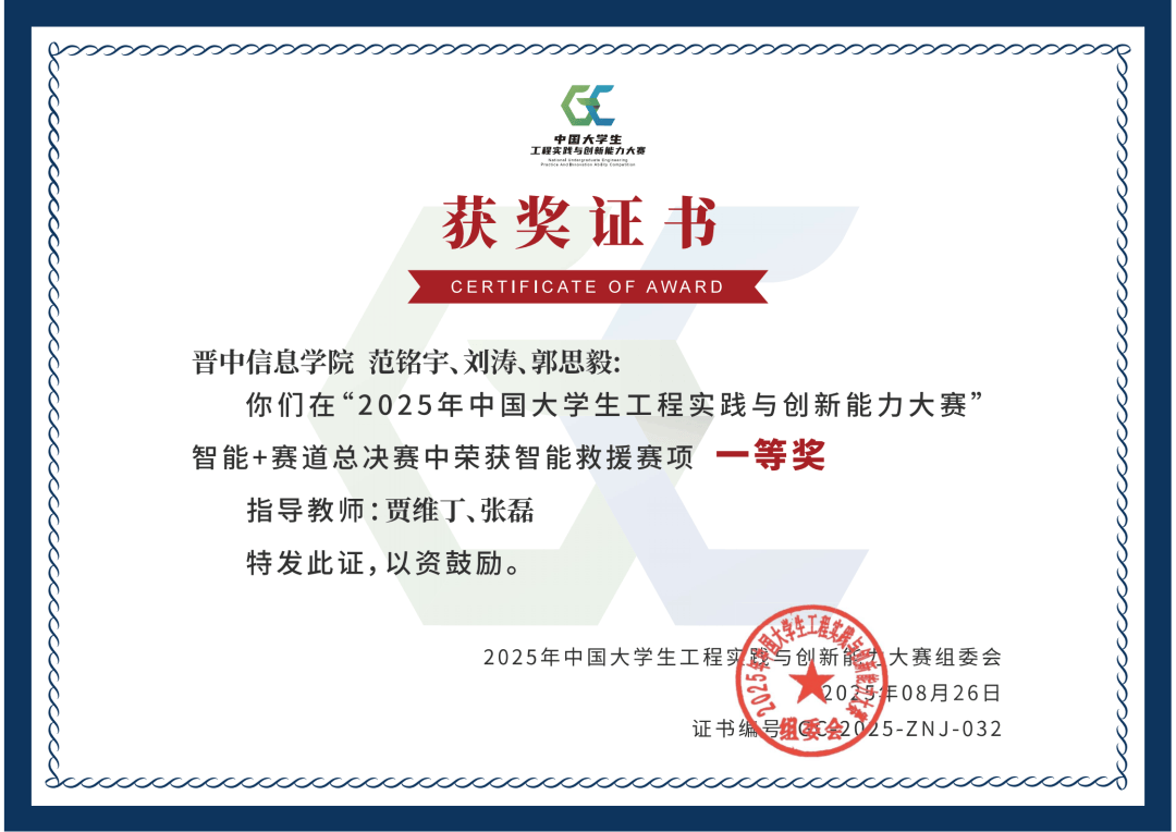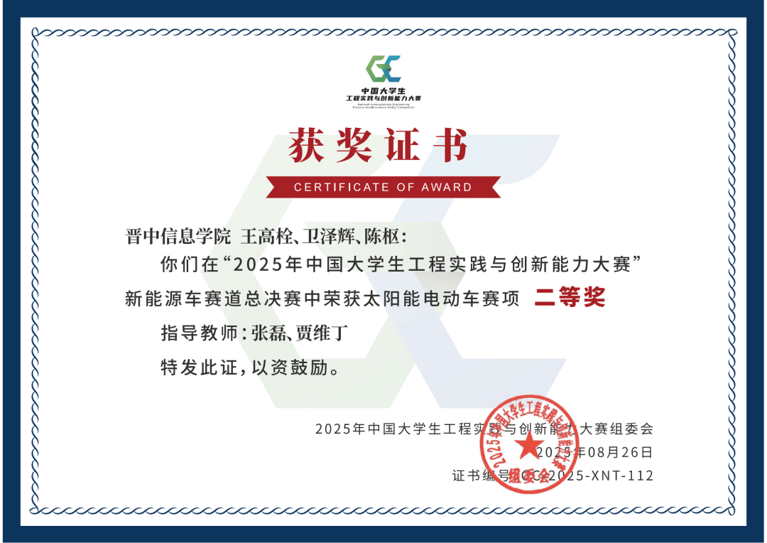 由赛由教育部高档教育司从办,教育部高档学校工程锻炼讲授指点委员会承办,大连理工大学协办的2025年中国大学生工程实践取立异能力大赛中,学校、贾维丁教员指点范铭宇、、郭思毅同窗荣获“智能+”赛道-智能救援赛项国度级集体一等;指点王高栓、卫泽辉、陈枢同窗荣获新能源车赛道-太阳能电动车赛项国度级集体二等。