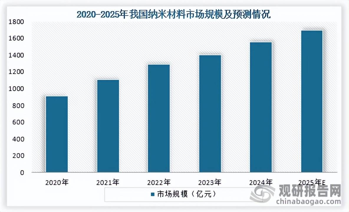 从纳米材料市场规模来看,2020年之后我国纳米材料市场规模持续增加,到2024年我国纳米材料市场规模约为1555。2亿元,估计到2025年我国纳米材料市场规模将跨越1700亿元。