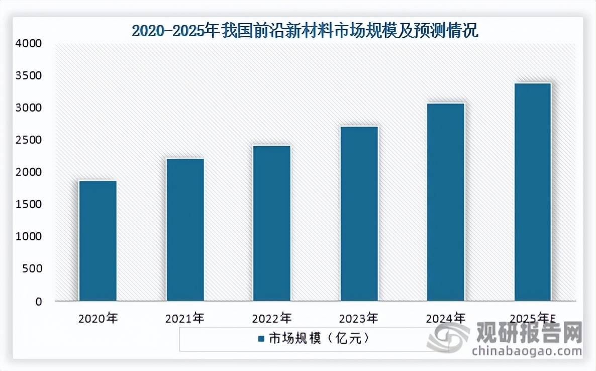 从市场规模来看,2020年到2024年我国前沿新材料市场规模持续增加,到2024年我国前沿新材料市场规模为3073亿元,估计2025年我国前沿新材料市场规模将达到3381亿元。